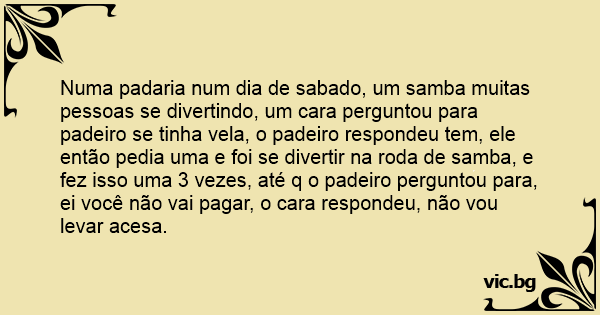 Numa padaria num dia de sabado, um samba muitas pessoas se divertindo, um cara perguntou para padeiro se tinha vela, o padeiro respondeu tem, ele então pedia uma e foi se divertir na roda de samba, e fez isso uma 3 vezes, até q o padeiro perguntou para, ei você não vai pagar, o cara respondeu, não vou levar acesa.
