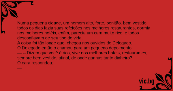 Numa pequena cidade, um homem alto, forte, bonitão, bem vestido, todos os dias fazia suas refeições nos melhores restaurantes, dormia nos melhores hotéis, enfim, parecia um cara muito rico, e todos desconfiavam de seu tipo de vida.