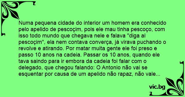 Numa pequena cidade do interior um homem era conhecido pelo apelido de pescoçim, pois ele mau tinha pescoço, com isso todo mundo que chegava nele e falava "diga ai pescoçim", ela nem contava converça, já virava puchando o revolve e atirando. Por matar muita gente ele foi preso e passo 10 anos na cadeia. Passar os 10 anos, quando ele tava saindo para ir embora da cadeia foi falar com o delegado, que chegou falando: O Antonio não vai se esquentar por causa de um apelido não rapaz, não vale apena não. Dai o delegado pergunto se o Antonio não queria ir num bar tumar uma geladinha. Depois de 10 anos sem beber Antonio aceito. Quando chegaram la no bar Antonio ficou numa mesa separada do delegado que ficou em per na porta do bar so observando. Com isso tinha um bebado no bar querendo beber mais, sendo que tava sem dinherio, o bebado foi aperriar o delegado: o senhor delegado, sera que o senhor não pode pagar uma dose de cana pra mim não. Dai o delegado rapaz, eu pago se voçe chegar na quele cara ali e chamar ele de pescoçim. Dai o bebado rapaiz mais não é que ele parece mesmo com o pescoçim, dai o delegado, mais é ele mesmo. Dai o bebado vo nada, depois aquele homi me mata, ele é perigoso. Ai o delagado disse á entao nada de pinga. Dai o bebado tumor coragem e foi la, tumo uma lapada de cana e foi la falar como homem. Sentor na cadeira dele e disse, diga ai rapaz quanto tempo. Bora tumar uma aqui, da ai o pescoçim, tu é maluco seu bebado eu nem te conheço, da ai o bebado conhece sim, agente pesco a 10 anos atraz la no riachu, se lembra nao rapaz. Dai Antonio, eu nunca pesquei com voçe, tais maluco seu bebado. Dai o bebado: PESCOÇIM!!! em seu delegado PESCOÇIM!!!!
