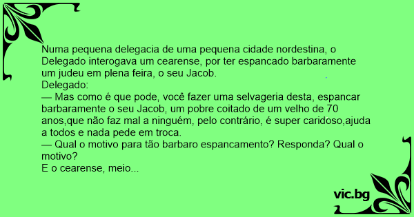 Numa pequena delegacia de uma pequena cidade nordestina, o Delegado interogava um cearense, por ter espancado barbaramente um judeu em plena feira, o seu Jacob.