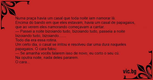 Encima do bando em que eles estavam, havia um casal de papagaios, que ao verem eles namorando começavam a cantar.