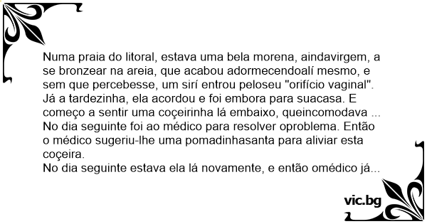 Numa praia do litoral, estava uma bela morena, aindavirgem, a se bronzear na areia, que acabou adormecendoalí mesmo, e sem que percebesse, um sirí entrou peloseu "orifício vaginal".