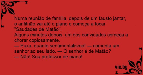Numa reunião de família, depois de um fausto jantar, o anfitrião vai até o piano e começa a tocar "Saudades de Matão".