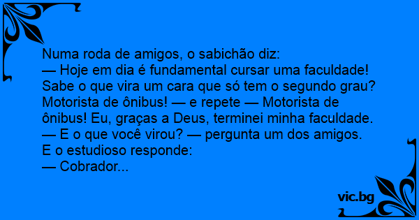 — Hoje em dia é fundamental cursar uma faculdade! Sabe o que vira um cara que só tem o segundo grau? Motorista de ônibus! — e repete — Motorista de ônibus! Eu, graças a Deus, terminei minha faculdade.