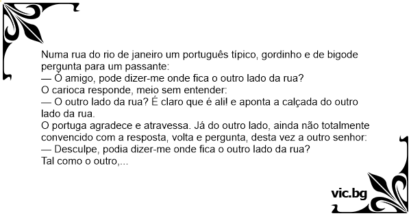 Numa rua do rio de janeiro um português típico, gordinho e de bigode pergunta para um passante: