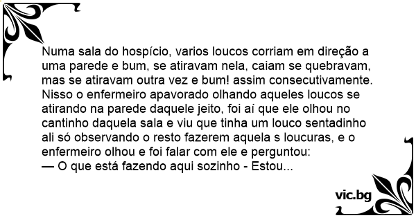 Numa sala do hospício, varios loucos corriam em direção a uma parede e вuм, se atiravam nela, caiam se quebravam, mas se atiravam outra vez e вuм! assim consecutivamente. Nisso o enfermeiro apavorado olhando aqueles loucos se atirando na parede daquele jeito, foi aí que ele olhou no cantinho daquela sala e viu que tinha um louco sentadinho ali só observando o resto fazerem aquela s loucuras, e o enfermeiro olhou e foi falar com ele e perguntou: