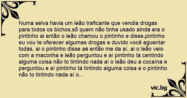 Numa selva havia um leão traficante que vendia drogas para todos os bichos,sõ quem não tinha usado ainda era o pintinho ai então o leão chamou o pintinho e disse,pintinho eu vou te oferecer algumas drogas e duvido vocë aguentar todas, ai o pintinho disse aé então me da aí, ai o leão veio com a maconha e leão perguntou e aí pintinho tá centindo alguma coisa não to tintindo nada aí o leão deu a cocaína e perguntou e aí pintinho tá tintindo alguma coisa e o pintinho não to tintindo nada aí o leão deu a heroína e perguntou e ai pintinho tá tintindo alguma coisa e o pintinho não to tintindo nada daí o leão retrucou: pintinho eu já ti dei todos o tipos de drogas e você não está tintindo nada, e o pintinho responde: