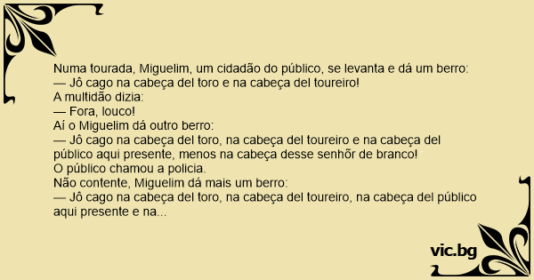 — Jô cago na cabeça del toro, na cabeça del toureiro e na cabeça del público aqui presente, menos na cabeça desse senhõr de branco!