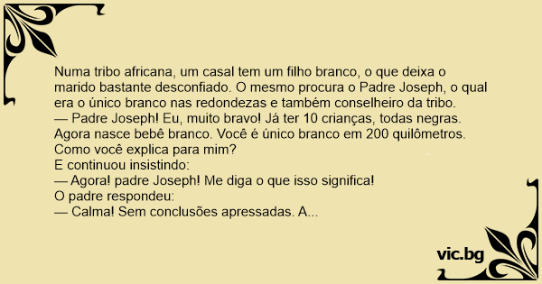 — Padre Joseph! Eu, muito bravo! Já ter 10 crianças, todas negras. Agora nasce bebê branco. Você é único branco em 200 quilômetros. Como você explica para mim?
