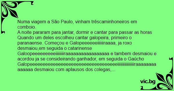 A noite pararam para jantar, dormir e cantar para passar as horas Quando um deles escolheu cantar galopeira, primeiro o paranaense. Começou e Galopeeeeeeiiiiiiraaaa, ja roxo desmaiou,em seguida o catarinense Galoopeeeeeeeeeiiiiiiiiraaaaaaaaaaaaaaaaa e tambem desmaiou e acordou ja se consideirando ganhador, em seguida o Gaúcho Galopeeeeeeeeeeeeeeeeeeeeeeeeeeeeeeeeeeiiiiiiiiiiiiiiiiraaaaaaaaaaaaaa desmaiou com aplausos dos colegas, mas não acordava quando o paranaense resolveu acorda-lo.