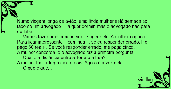 Uma loira que dormia em sua poltrona do avião quando ao seu lado senta um advogado, e a cotuca e pergunta: — Vamos fazer um jogo? - a loira olha para o advogado e o ignora e dorme novamente. Vamos...