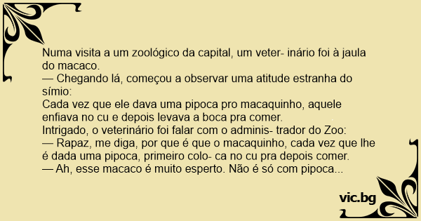 — Rapaz, me diga, por que é que o macaquinho, cada vez que lhe é dada uma pipoca, primeiro colo- ca no cu pra depois comer.