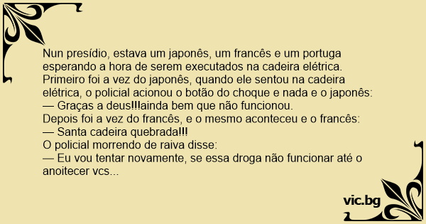 Nun presídio, estava um japonês, um francês e um portuga esperando a hоrа de serem executados na cadeira elétrica.