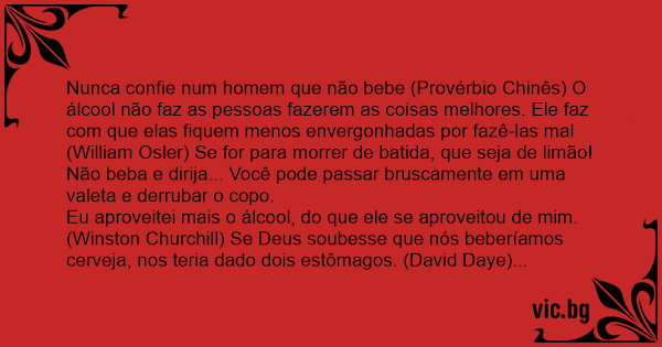 Nunca confie num homem que não bebe (Provérbio Chinês) O álcool não faz as pessoas fazerem as coisas melhores. Ele faz com que elas fiquem menos envergonhadas por fazê-las mal (William Osler) Se for para morrer de batida, que seja de limão!