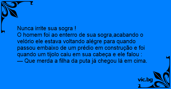 O indivíduo voltando do enterro de sua sogra, passou em frente de um edifício em construção, nisso cai um tijolo em sua cabeça. Exclama o genro : — Já sei porra, chegaste no céu, não precisava me...