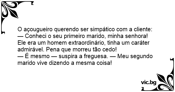 — É mesmo — suspira a freguesa. — Meu segundo marido vive dizendo a mesma coisa!