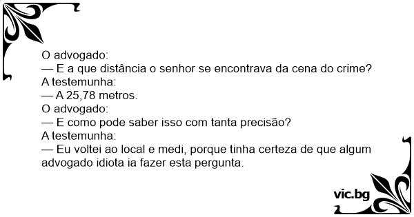 — Eu voltei ao local e medi, porque tinha certeza de que algum advogado idiота ia fazer esta pergunta.