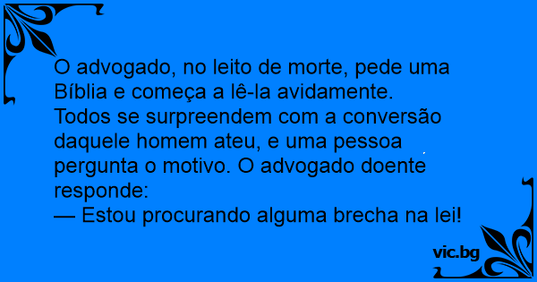 Den gamle advokat var alvorligt syg, og sad og læste i Bibelen, da vennen kom på besøg. "Men hvad laver du dog?", spurgte han overrasket. "Leder efter smuthuller!", svarede advokaten tørt.