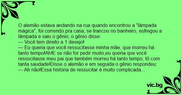 — Eu queria que você ressucitasse minha mãe, que morreu há tanto tempo!Ah!E se não for pedir muito,eu queria que você ressucitasse meu pai que também morreu há tanto tempo, tô com tanta saudade!Disse o alemão e em seguida o gênio respondeu: