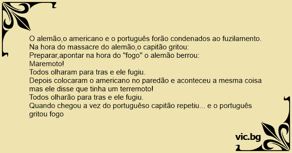 Quando chegou a vez do portuguêso capitão repetiu... e o português gritou fogo