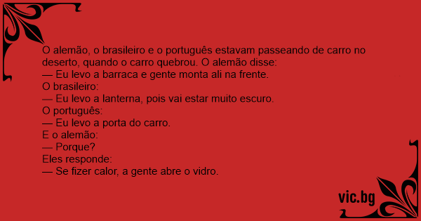 O alemão, o brasileiro e o português estavam passeando de carro no deserto, quando o carro quebrou. O alemão disse: