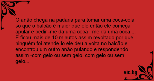 O anão chega na padaria para tomar uma coca-cola so que o balcão é maior que ele então ele começa apular e pedir -me da uma coca , me da uma coca ...