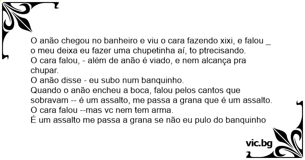 O anão chegou no banheiro e viu o cara fazendo xixi, e falou _ o meu deixa eu fazer uma chupetinha aí, to ptrecisando.
