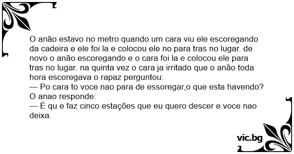 O anão estavo no metro quando um cara viu ele escoregando da cadeira e ele foi la e colocou ele no para tras no lugar. de novo o anão escoregando e o cara foi la e colocou ele para tras no lugar. na quinta vez o cara ja irritado que o anão toda hоrа escoregava o rapaz perguntou: