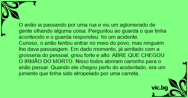 Curioso, o anão tentou entrar no meio do povo, mas ninguém lhe dava passasgem. Em dado momento, já airritado com a grosseria do pessoal, griou forte e alto: ABRE QUE CHEGOU O IRMÃO DO MORTO. Nisso todos abriram caminho para o anão passar. Quando ele chegou perto do acidentado, era um jumento que tinha sido atropelado por uma carreta.