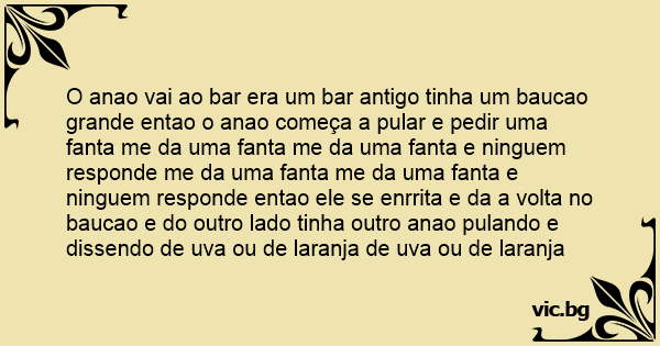 O anao vai ao bar era um bar antigo tinha um baucao grande entao o anao começa a pular e pedir uma fanta me da uma fanta me da uma fanta e ninguem responde me da uma fanta me da uma fanta e ninguem responde entao ele se enrrita e da a volta no baucao e do outro lado tinha outro anao pulando e dissendo de uva ou de laranja de uva ou de laranja