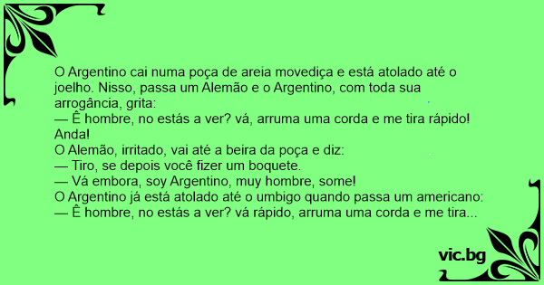 O Argentino cai numa poça de areia movediça e está atolado até o joelho. Nisso, passa um Alemão e o Argentino, com toda sua arrogância, grita: