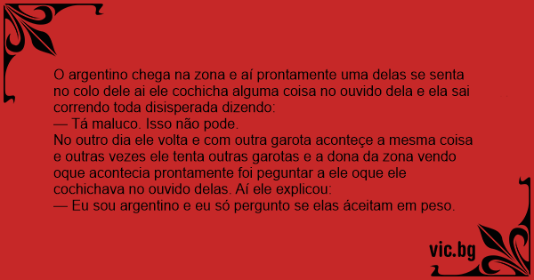O argentino chega na zona e aí prontamente uma delas se senta no colo dele ai ele cochicha alguma coisa no ouvido dela e ela sai correndo toda disisperada dizendo: