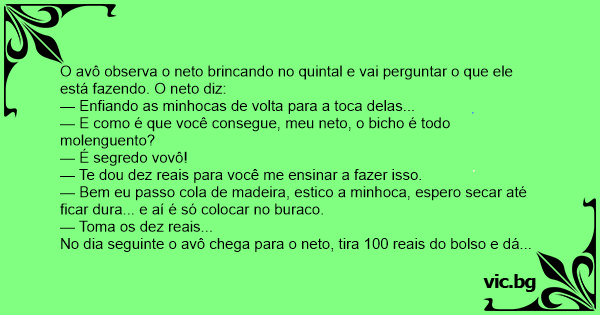 Um certo dia, o menino estava brincando no quintal, quando seu avô, curioso, perguntou: — Meu netinho, o que você está fazendo? — Eu estou colocando as minhocas em seus buracos. — Mas como, se elas...