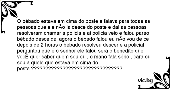 O bébado estava em cima do poste e falava para todas as pessoas que ele nÃo ia desce do poste e dai as pessoas resolveram chamar a policia e ai policia veio e falou parao bébado desce dai agora o bébado falou eu nÃo vou de ce depois de 2 horas o bébado resolveu descer e a policial perguntou que é o senhor ele falou sera o benedito que vocÊ quer saber quem sou eu , o mano fala sério , cara eu sou a quele que estava em cima do poste ????????????????????????????????