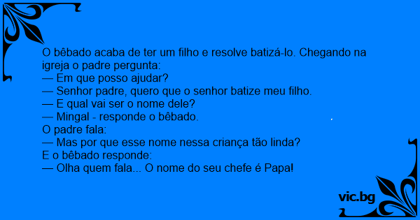 O bêbado acaba de ter um filho e resolve batizá-lo. Chegando na igreja o padre pergunta: