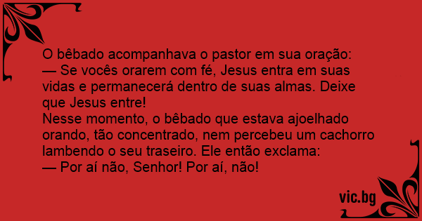 Nesse momento, o bêbado que estava ajoelhado orando, tão concentrado, nem percebeu um сасhоrrо lambendo o seu traseiro. Ele então exclama: