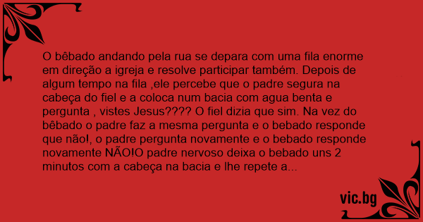 O bêbado andando pela rua se depara com uma fila enorme em direção a igreja e resolve participar também. Depois de algum tempo na fila ,ele percebe que o padre segura na cabeça do fiel e a coloca num bacia com agua benta e pergunta , vistes Jesus???? O fiel dizia que sim. Na vez do bêbado o padre faz a mesma pergunta e o bebado responde que não!, o padre pergunta novamente e o bebado responde novamente NÃO!O padre nervoso deixa o bebado uns 2 minutos com a cabeça na bacia e lhe repete a pergunta gritando , o bebado quase sem ar responde:Padre, o senhor tem certeza que Jesus caiu aqui dentro???