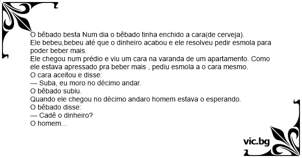 O bêbado besta Num dia o bêbado tinha enchido a cara(de cerveja).