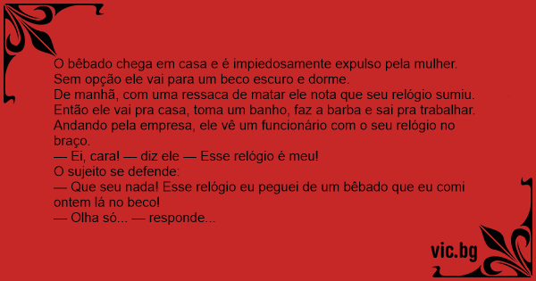 — Que seu nada! Esse relógio eu peguei de um bêbado que eu comi ontem lá no beco!