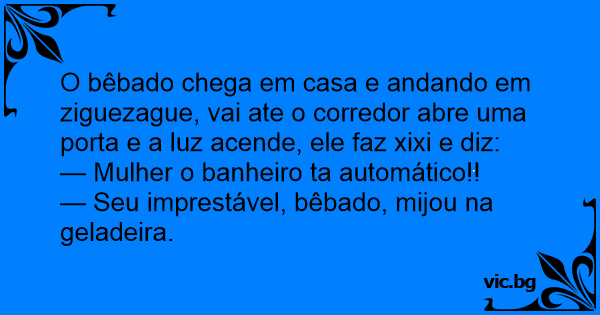 O bêbado chega em casa e andando em ziguezague, vai ate o corredor abre uma porta e a luz acende, ele faz xixi e diz: