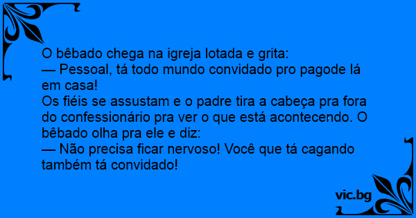 Os fiéis se assustam e o padre tira a cabeça pra fora do confessionário pra ver o que está acontecendo. O bêbado olha pra ele e diz: