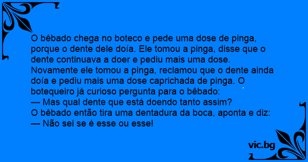 O bêbado chega no boteco e pede uma dose de pinga, porque o dente dele doía. Ele tomou a pinga, disse que o dente continuava a doer e pediu mais uma dose. Novamente ele tomou a pinga, reclamou que o dente ainda doía e pediu mais uma dose caprichada de pinga. O botequeiro já curioso pergunta para o bêbado: