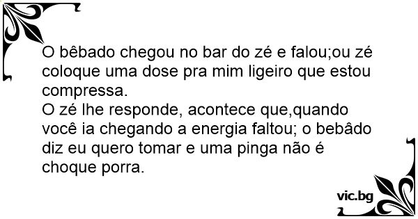 O bêbado chegou no bar do zé e falou;ou zé coloque uma dose pra mim ligeiro que estou compressa.