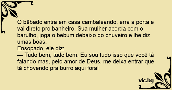 O bêbado entra em casa cambaleando, erra a porta e vai direto pro banheiro. Sua mulher acorda com o barulho, joga o bebum debaixo do chuveiro e lhe diz umas boas.