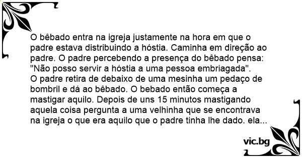 O bêbado entra na igreja justamente na hоrа em que o padre estava distribuindo a hóstia. Caminha em direção ao padre. O padre percebendo a presença do bêbado pensa: