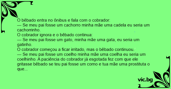 — Se meu pai fosse um coelho minha mãe uma coelha eu seria um coelhinho. A paciência do cobrador já esgotada fez com que ele gritasse bêbado se teu pai fosse um соrnо e tua mãe uma prostituta o que tu seria?