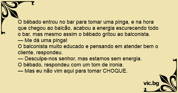 O bêbado entrou no bar para tomar uma pinga, e na hоrа que chegou ao balcão, acabou a energia escurecendo todo o bar, mas mesmo assim o bêbado gritou ao balconista.
