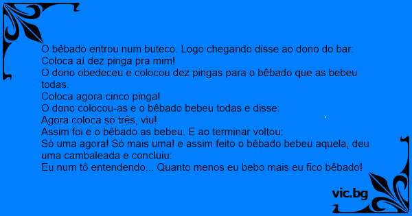 O dono obedeceu e colocou dez pingas para o bêbado que as bebeu todas.