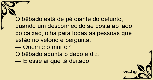 O bêbado está de pé diante do defunto, quando um desconhecido se posta ao lado do caixão, olha para todas as pessoas que estão no velório e pergunta:
