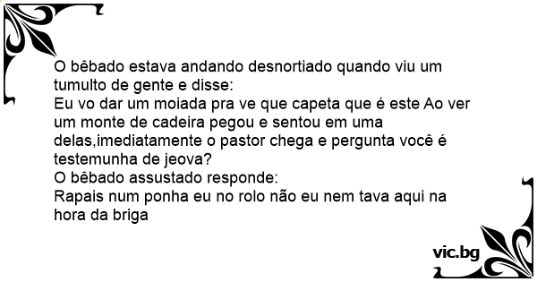 Eu vo dar um moiada pra ve que capeta que é este Ao ver um monte de cadeira pegou e sentou em uma delas,imediatamente o pastor chega e pergunta você é testemunha de jeova?